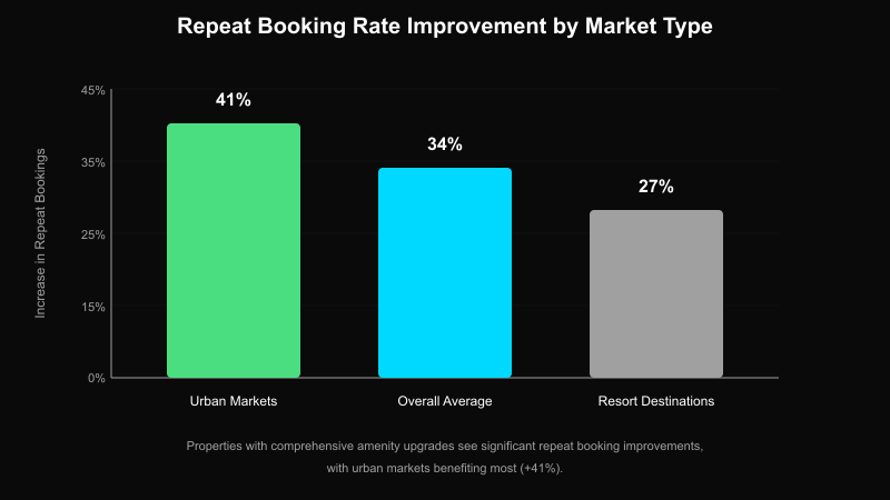 Properties implementing comprehensive amenity upgrades experienced a 34% increase in repeat booking rates over 6 months, with urban markets showing 41% improvement.