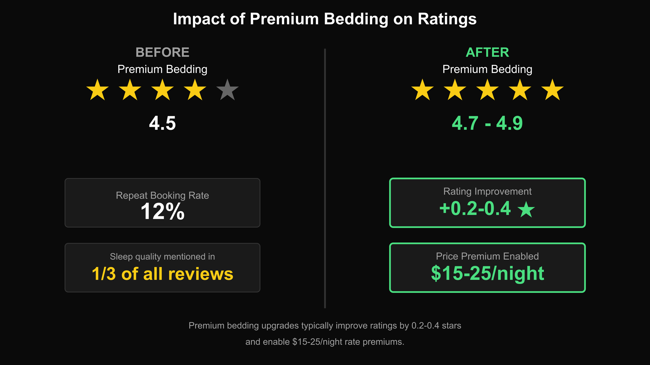 Sleep quality is the single most important factor in guest reviews, appearing in approximately one-third of all vacation rental reviews. Premium bedding upgrades typically improve ratings by 0.2-0.4 stars.